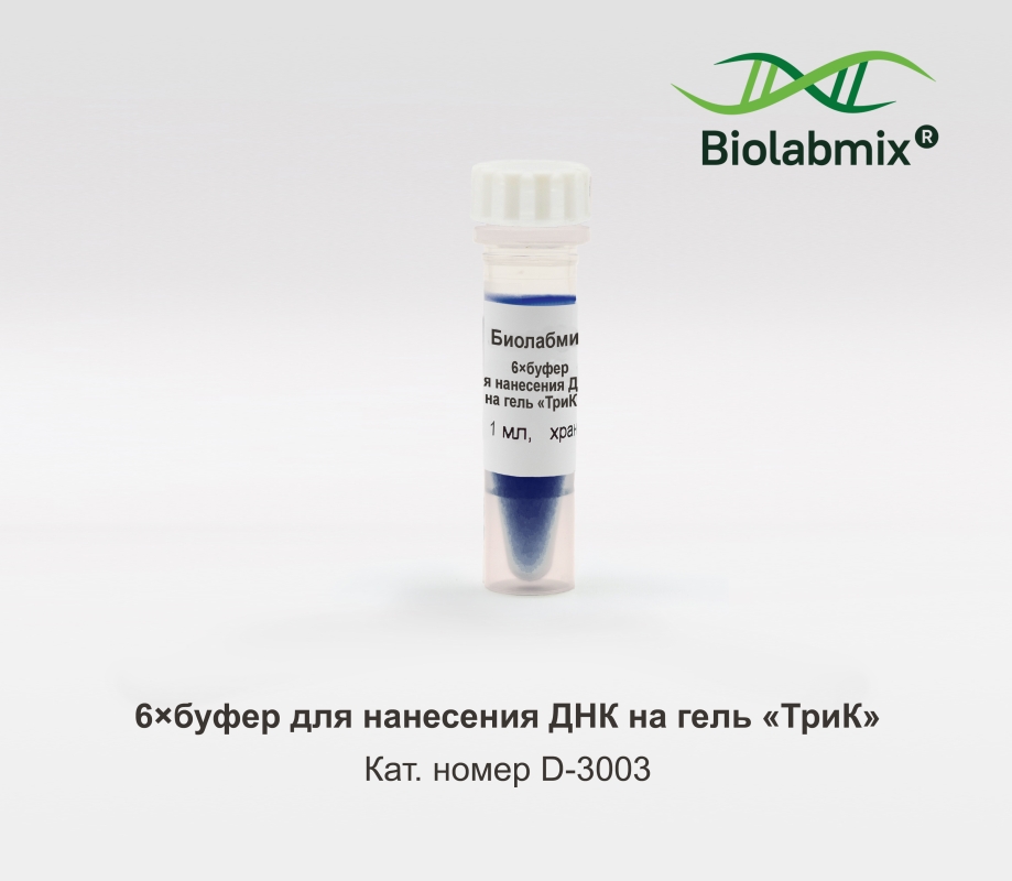 6-кратный буфер для хранения и нанесения образцов ДНК «ТриК» содержит три красителя для оценки подвижности в геле: бромфеноловый синий, ксиленцианол FF и Оранжевый G. Области применения: Рекомендован для нанесения образцов ДНК на гель при анализе гель-электрофорезом