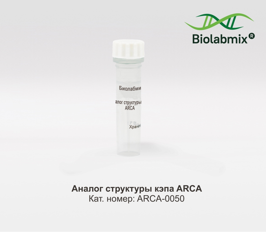 Продукт представляет собой стерильный 10 мМ раствор аналога структуры кэпа ARCA в виде аммонийной соли в воде. Одним из первых и ключевых этапов созревания мРНК в клетках является добавление 5`-кэп-структуры, которая представляет собой 5`-5`-трифосфатную связь между 5`-концом РНК и гуанозиновым нуклеотидом. При получении искусственной мРНК кэп необходимо включать в структуру в ходе транскрипции (котранскрипционно), чтобы стабилизировать мРНК и значительно улучшить трансляцию внутри клеток.  Аналог структуры кэпа Anti Reverse Cap Analog (ARCA) является одним из самых изученных и описанных вариантов структуры кэпа для искусственных мРНК, обеспечивающим высокую эффективность трансляции мРНК в клетках млекопитающих. Продукт протестирован на присутствие эндо- и экзонуклеазной активности и свободен от примесей ДНКаз и РНКаз. Чистота нуклеотида по данным ВЭЖХ не менее 96%. Функциональная активность подтверждена in vitro в реакции транскрипции Количество: 50 мкл