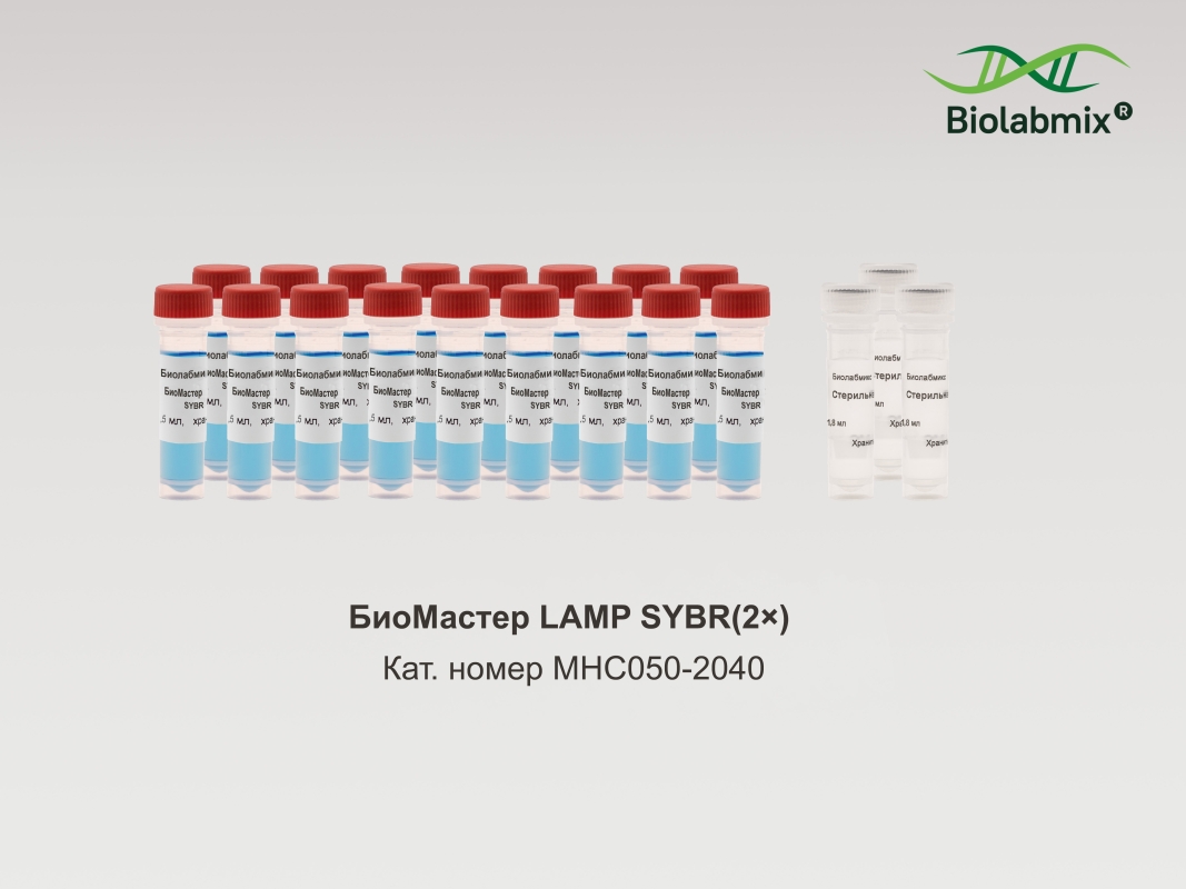 Набор БиоМастер LAMP SYBR (2?) содержит 2?реакционную смесь БиоМастер LAMP SYBR (2?) и стерильную воду. Состав БиоМастер LAMP SYBR (2?): - высокопроцессивныи? большои? фрагмент (LF) Bst ДНК-полимеразы; - смесь dNTPs, буфер, Mg2+ (6 мМ) и SYBR Green I. Представленная форма набора экономит время и снижает вероятность контаминации. Область применения: ? Петлевая изотермическая амплификация в режиме реального времени с использованием интеркалирующего красителя SYBR Green I ? Петлевая изотермическая амплификация с детекциеи? по конечнои? точке. Смесь оптимизирована для проведения эффективнои? и воспроизводимои? LAMP в режиме реального времени с образцами геномнои?, плазмиднои? и вируснои? ДНК. Преимущества использования ? Смесь окрашена для облегчения раскапывания; ? Сокращается время на подготовку реакции; ? Снижается вероятность контаминации при смешивании компонентов ПЦР;  ? Стандартизируются условия постановки однотипных реакций (снижается погрешность при смешивании компонентов ПЦР в разных экспериментах).
