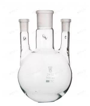 КОЛБА 500 МЛ, КРУГЛОДОННАЯ, ТРЕХГОРЛАЯ, СТЕКЛЯННАЯ, С ПАРАЛЛЕЛЬНЫМИ ГОРЛАМИ - CENTER 29/32 - ARM 29/32