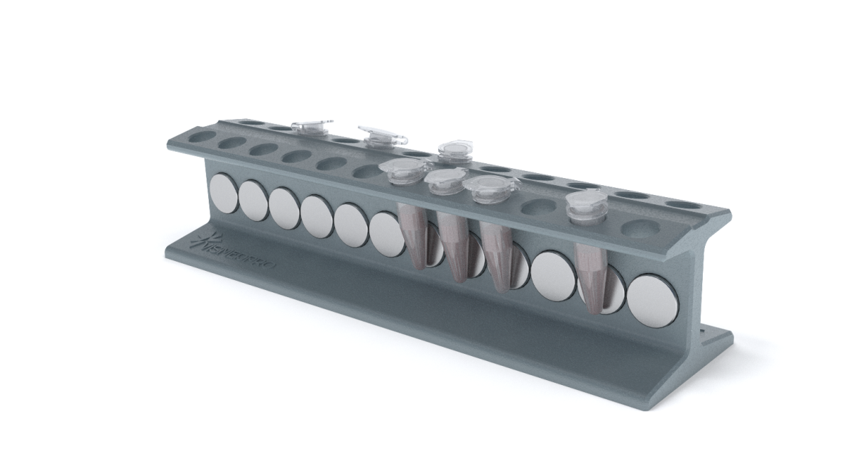 Штатив для магнитного разделения, изготовленный из цельного литья, предназначенный для установки 24 микроцентрифужных пробирок объемом 1,5 - 2 мл. Магнитный штатив VISMEDPRO разработан специально для эффективного разделения шариков из указанных пробирок. В конструкции штатива предусмотрено угловое расположение пробирок, что обеспечивает притяжение шариков к задней стенке. Это удобство делает процесс аспирации более легким, а также позволяет кончикам пробирок свободно перемещаться по внутренней стороне передней стенки без повреждения гранул.  Магнитный штатив на 24 места, предназначенный для применения с пробирками объемом 1,5-2 мл, выполнен из цельного литья. Кроме того, он оснащен усиленными магнитами и силиконовыми ножками для улучшения устойчивости. Аналог: Permagen - USA