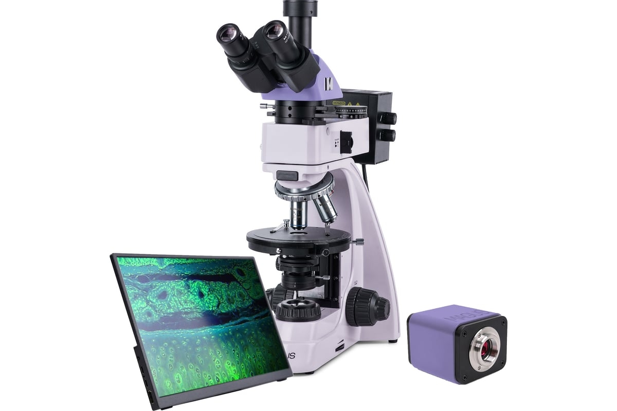 Микроскоп предназначен для исследования объектов в поляризованном и обычном свете. В проходящем свете изучают геологические шлифы, тонкие анизотропные биологические и полимерные объекты. В отраженном свете исследуют непрозрачные аншлифы с отполированной одной стороной. Толщина аншлифа произвольная, обычно 5–10 мм. Микроскоп позволяет изучать непрозрачные объекты толщиной до 15 мм. Для формирования изображения поляризационный микроскоп использует оптическое свойство двойного лучепреломления анизотропных объектов. Плоско-поляризованный свет при прохождении через анизотропный образец расщепляется на два луча и меняет плоскость поляризации. Анализатор приводит колебания лучей в одну плоскость, где они интерферируют. Яркое высококонтрастное изображение меняет цвет при вращении столика. Объективы микроскопа свободны от внутренних напряжений. В промежуточном тубусе установлены анализатор и линза Бертрана, есть слот для установки компенсаторов. Микроскоп используется в кристаллографии, петрографии, минералогии, криминалистике, медицине и других областях науки. Цифровая камера MAGUS CHD40 – цифровая HDMI-камера с тремя видеоинтерфейсами и автоматическим переключением между 4K и Full HD в зависимости от разрешения монитора. Камера оснащена сенсором 8 Мпикс и формирует реалистичное изображение в разрешении 4К (3840x2160 пикс) при подключении через интерфейс HDMI или USB 3.0. При подключении через Wi-Fi разрешение изображения Full HD (1920x1080 пикс). Камера использует интерфейс HDMI для прямого подключения к телевизору, монитору или проектору. В этом режиме камера работает автономно, без компьютера. HDMI-подключение обеспечивает высокую и стабильную скорость передачи информации от камеры к внешнему экрану. Подключение к компьютеру осуществляется через сеть Wi-Fi и USB 3.0. Видеозапись ведется с частотой 30 кадров в секунду. Камера сочетает в себе большое значение FPS и высокую пропускную способность интерфейса HDMI, поэтому видео ощущаются «живыми», нет зависаний и разрывов между кадрами. На максимальном разрешении изображение информативно, движущиеся объекты видны без шлейфов, передвижение объекта отображается без задержек. Монитор Монитор MAGUS MCD40 предназначен для создания системы визуализации микроскопа MAGUS . Он подключается к установленной на микроскоп камере и выводит изображение в реальном времени. Поддерживаются HDMI-камеры MAGUS, работающие в разрешении 4К. Диагональ экрана – 13,3 дюйма. Матрица IPS обеспечивает яркую картинку с широкими углами обзора: если смотреть на монитор под углом, цветопередача не искажается. Монитор устанавливается на стол или полку на откидную подставку или крепится напрямую к камере или к штативу. Визуальная насадка Тринокулярная визуальная насадка рассчитана на бесконечность. Цифровые устройства захвата изображения устанавливаются в вертикальный тубус канала визуализации. Переключатель светового потока направляет 100% света или на цифровую камеру, или на окулярные тубусы. Диоптрийная подвижка на левом окулярном тубусе. Револьверное устройство Револьвер на 5 объективов. Свободное отверстие служит для настройки положения лампы осветителя отраженного света. В свободное гнездо револьвера лаборант устанавливает дополнительный объектив, который позволит получить еще одно увеличение. Конструкция револьвера с наклоном к 