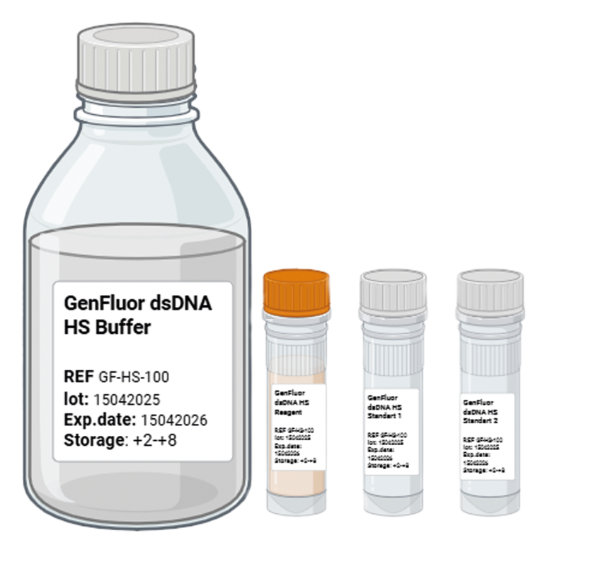 Набор реагентов GenFluor dsDNA HS Assay Kit предназначен для измерения количества двухцепочечной ДНК на флуориметре в диапазоне концентраций 0,1-100 нг/мкл.   - Набор применяется для точного измерения концентрации ДНК перед использованием в различных молекулярно-биологических приложениях, в том числе ПЦР, секвенировании по Сэнгеру, массовом параллельном секвенировании.  - Набор совместим со всеми сериями приборов Qubit Fluorimeter (ThermoFisher Scientific, США), Allsheng Fluo (Allsheng, Китай).   - GenFluor dsDNA HS Reagent, входящий в состав набора, высокоселективен в отношении двухцепочечной ДНК, поэтому на работу компонентов набора не влияет наличие примеси одноцепочечной ДНК, РНК, белков
