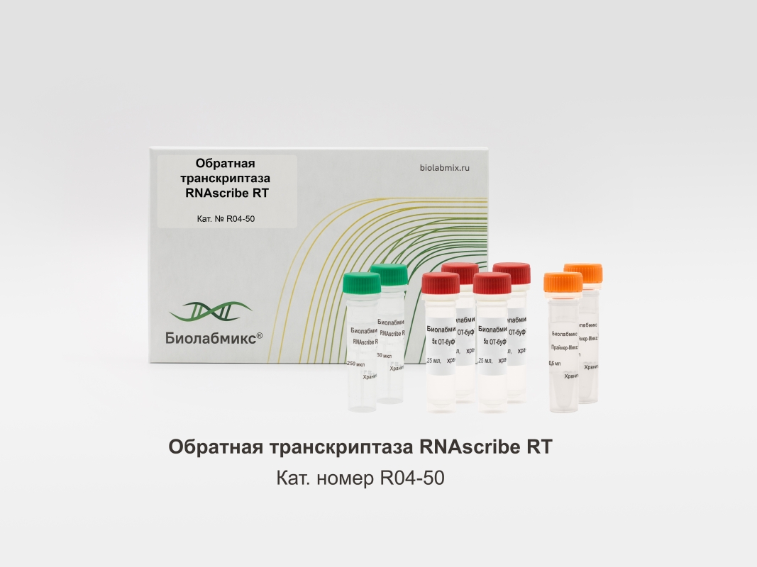 Область применения: ? Синтез первой цепи кДНК для ОТ-ПЦР и ОТ-ПЦР в режиме реального времени; ? Синтез кДНК для клонирования; ? Синтез кДНК сложных и длинных матриц; ? Получение меченых кДНК зондов для микрочипов (microarray); ? Мечение ДНК. Свойства: ? Позволяет синтезировать фрагменты кДНК до 9 т.п.о. и включать модифицированные основания ? Обеспечивает высокий выход кДНК: выход реакции составляет не менее 100 нг первой цепи кДНК при 100 е. а. RNAscribe RT на 1 мкг РНК ? Быстрая скорость реакции позволяет выполнять синтез всего за 10 минут ? Содержит оптимизированную смесь неспецифических праймеров ? Снижена активность РНКазы H ? Содержит ингибитор РНКаз ? Содержит 5 ? ОТ-буфер-mix  Фермент обладает повышенной устойчивостью к хранению при положительной температуре