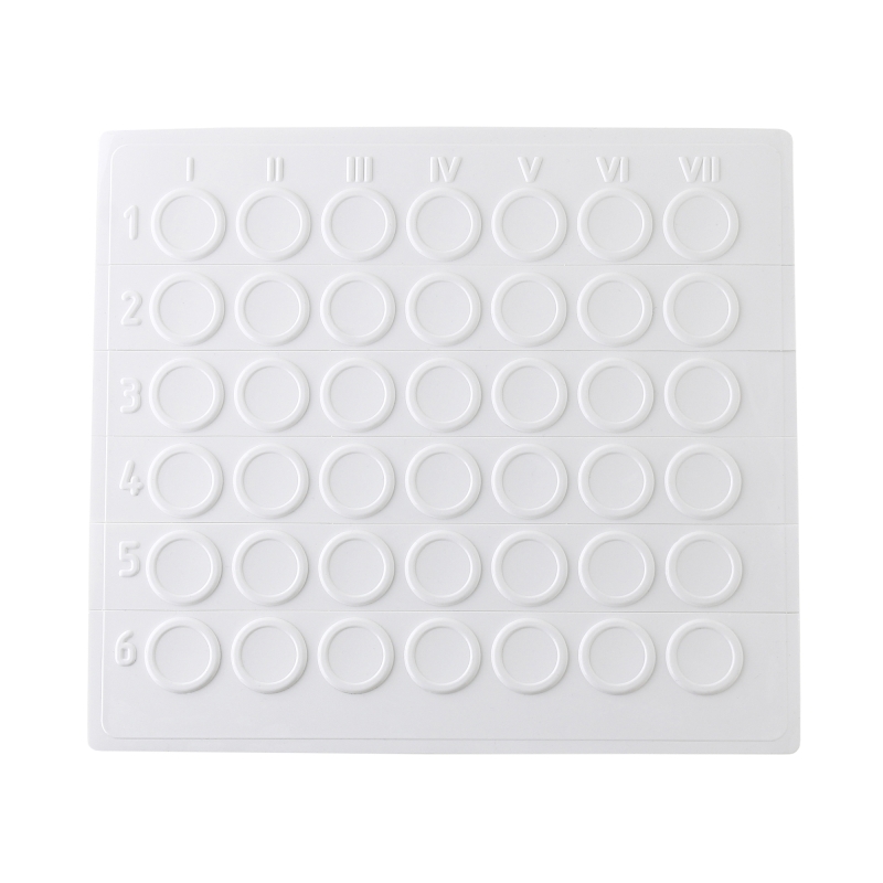 Планшет предназначен для определения групп крови методом прямой реакции агглютинации и проведения проб на совместимость донора и реципиента. 7 строк по 6 лунок в каждой. Цифровая маркировка — «1, 2, 3, 4, 5, 6» и «I, II, III, IV, V, VI, VII» облегчает проведение серологических и иммунологических работ. Лунки круглые, плоскодонные. Планшет специально сделан таким образом, что капля находится в центре лунки и позволяет четко рассмотреть агглютинацию. Делится на 6 планшетов по 7 лунок