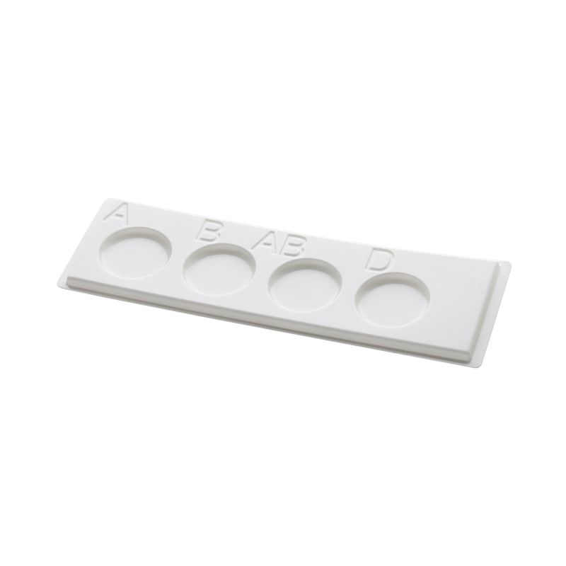 Планшет для определения группы крови на 4 лунки предназначен для типирования группы крови отдельного пациента по системе АВ0 Цоликлонами анти-А, анти-В и анти-АВ и по системе /Резус/Цоликлоном анти-D. Лунки круглые, плоскодонные. Планшет специально сделан таким образом, что капля находится в центре лунки и позволяет четко рассмотреть агглютинацию.