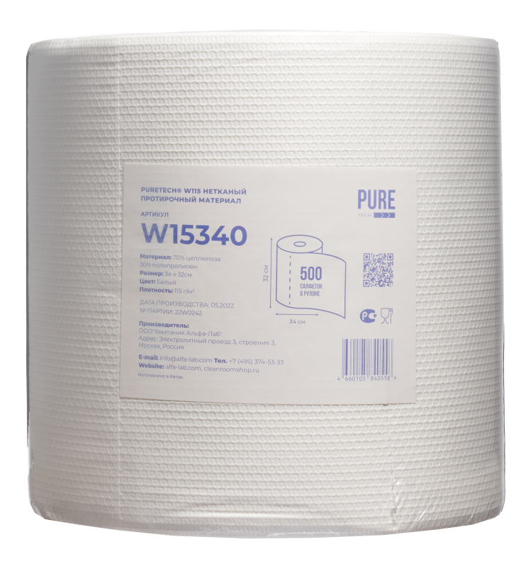PURETECH® W115 НЕТКАНЫЙ ПРОТИРОЧНЫЙ МАТЕРИАЛ 115ГР/М2, 1СЛОЙ, БЕЛЫЙ, 34Х32СМ, 500 Л/РУЛОН