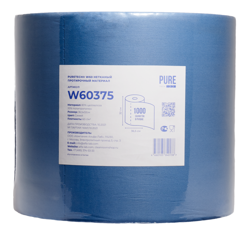 PURETECH® W60 НЕТКАНЫЙ ПРОТИРОЧНЫЙ МАТЕРИАЛ, 60Г/М2, 1СЛОЙ, СИНИЙ, 36,5Х32СМ, 1000 Л/РУЛОН